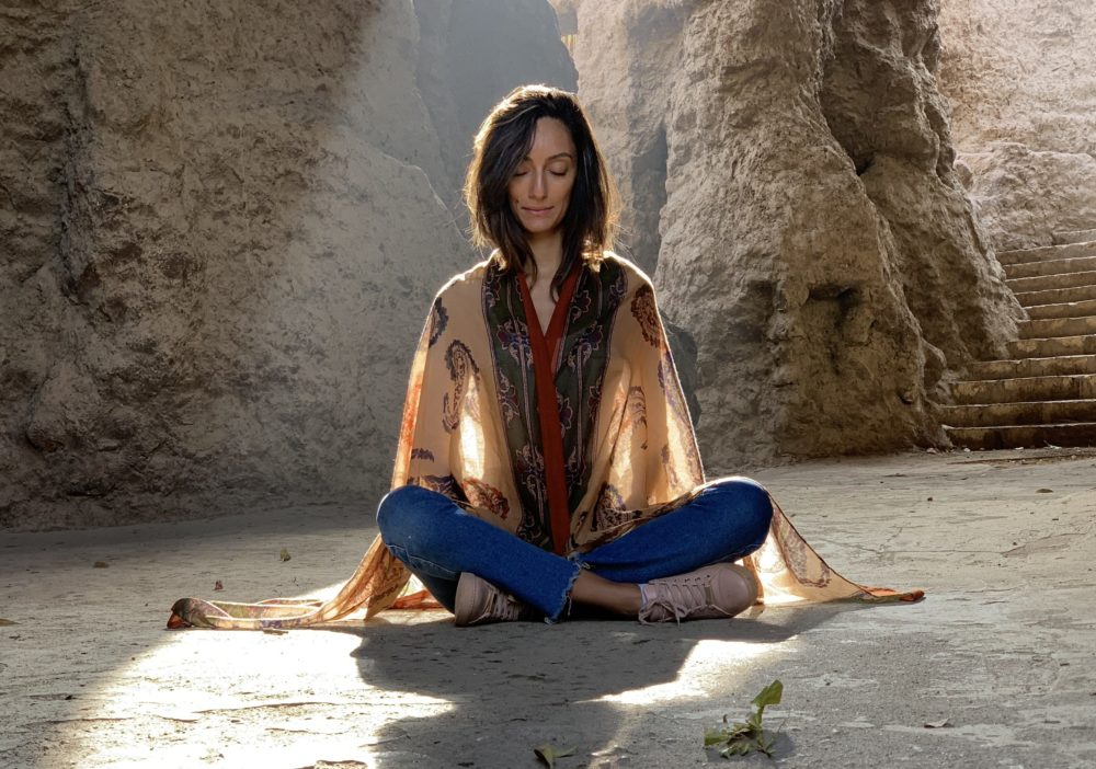 Omniya demonstrating the alternate nostril breathing exercise